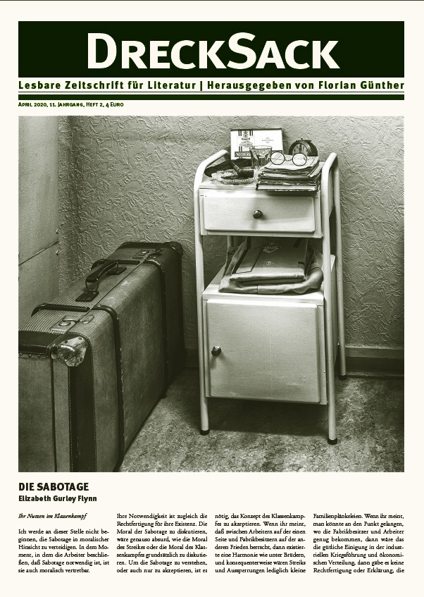Gedicht "Quicke Flucht" wurde in der Aprilausgabe 2020 der DRECKSACK-Literaturzeitschrift (Berlin) veröffentlicht. Weitere AutorInnen: Gerd Adloff, Eric Ahrens, Michael Arenz, Florian Günther, Elizabeth Gurley Flynn, Jürgen Heymann, Katja Horn, Jiri Kandeler, Harald Kappel, Susann Klossek, Jochen Knoblauch, Patrick Krause, Alexander Krohn, Clint Lukas, Klaus Märkert, Matthias Merkelbach, Thomas Meyer-Falk, Thowald Proll, Niklas Rokahr, Rüdiger Saß, Frank Schäfer, Katrin Schings, Nicola Seitz, Erik Steffen, Silke Vogten. Fotografien: Birgit Buchholz