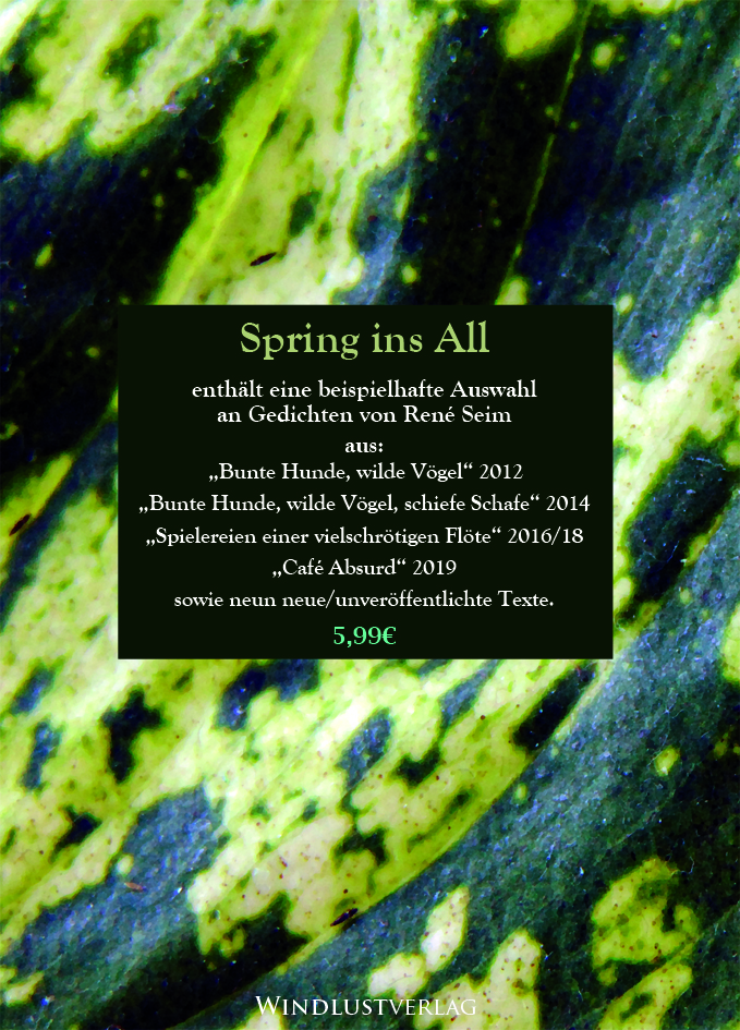 Ein Lyrik Best Of aus den bisherig drei Lyrikbänden ("Bunte Hunde, wilde Vögel 1+2", "Spielereien einer vielschrötigen Flöte" und dem kommenden Prosa-Lyrik-Mix-Buch "Café Absurd".